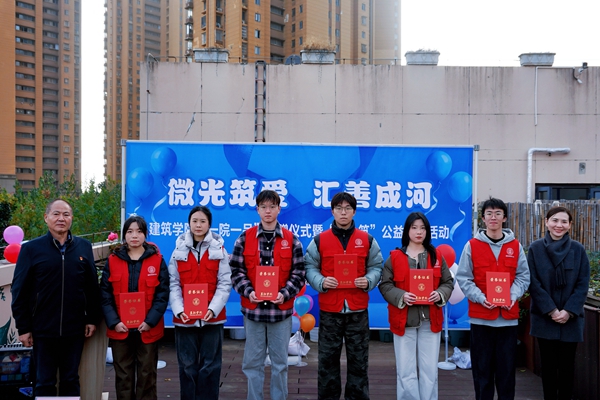 活动伊始,建筑学院党总支副书记郝勇首先致辞,他表示,本次活动是学院履行社会责任、强化实践育人的重要举措,展现了高校在推动残疾人事业发展中的积极作用。随后,郝勇副书记代表学院向新西善慈善基金会永盛社区专项基金捐赠了象征“爱心善款”的捐赠支票。永盛社区党委书记霍佰义接受捐赠并颁发证书,他在答谢辞中说到,“每一笔捐赠的义卖善款,都凝聚着大家的爱心与善意,此笔善款将用于‘善小筑’蓝丝带助残康复花园项目。微光‘筑’爱,汇‘善’成河,让我们共同奏响‘雨爱同行’之歌。”