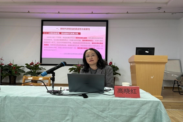 在随后专题党课中,高晓红教授为全体教师带来了一场既有理论高度又有实践温度的专题报告。高教授从现实、历史与个人三个维度,深刻剖析了新时代讲担当的紧迫性。她指出,当前世界百年未有之大变局加速演进,思政课教师作为马克思主义理论的传播者,必须具备“知重负重、知难而进”的担当精神。她结合习近平总书记的成长历程和从政经历,生动讲述了习近平总书记如何在不同岗位上践行“我将无我,不负人民”的崇高情怀,为在场教师树立了光辉榜样。针对思政课建设的具体实践,高教授详细解读了习近平总书记提出的“六要”标准与“八个相统一”要求。她强调,思政课是落实立德树人根本任务的关键课程,教师不仅要成为知识的传播者,更要成为学生理想信念的引路人。她指出,在数字化时代,思政课教师要善于利用AI、大数据等新技术赋能教学,推动教材体系向教学体系转化,严守意识形态底线,努力成为学生为学、为事、为人的“大先生”。